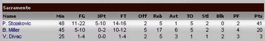 But Stojakovic, who entered tied for third in the NBA with a 24.3 per-game scoring average, was the main reason the Kings won their fourth straight and 16 of their last 18. He made five of Sacramento's nine 3-pointers, and converted 14-of-15 free throws, including three with 11.7 seconds left to reach his career high.