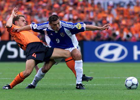 - Dutch team captain Frank de Boer (L) and Savo Milosevic from Yugoslavia get tangled up.